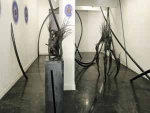 "Heykellerimi mekândan çıkıyormuş gibi yerleştirerek mekânın duvarlarını, zeminini ya da kullanılabilecek her alanı heykele dahil ediyorum. Dolayısıyla izleyici galeriye girdiğinde o da galerideki gaga ve tırnak mücadelesinin bir parçası oluyor. Bir grup heykelim hepimizin belleğinde iz bırakan 'elektrik tellerinde seyirci kuşlardan' yola çıkarak hazırladığım, metal borulara dizilmiş, metal telleri birleştirerek yaptığım pençelerden oluşuyor. Bu borular galerinin duvarından ve zemininden çıkıyormuş gibi görünüyor. Aynı temada hazırlanmış madalyonlar ise serinin en küçük boyutlu parçalarını oluşturuyor. Dış yüzeyleri pürüzsüz, yalın, ışık ve gölgeyi keskin görebildiğimiz formlardan oluşan ahşap tırnak ve gagalar ise sergiyi oluşturan bir diğer parçalar."