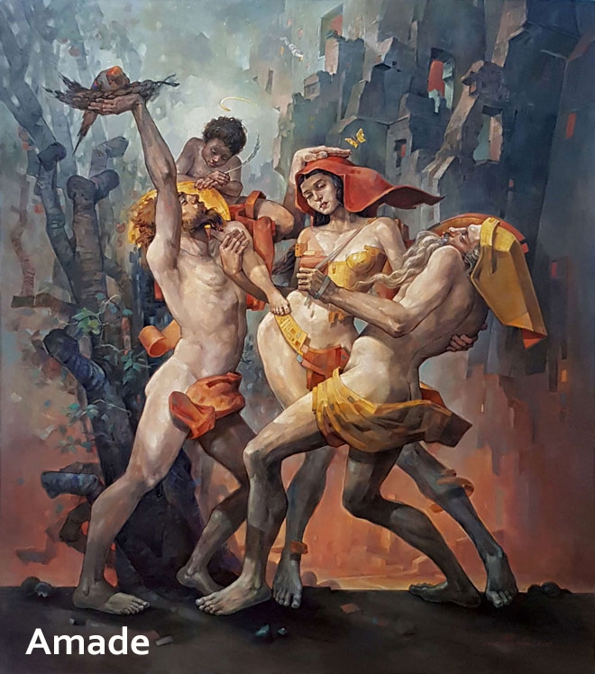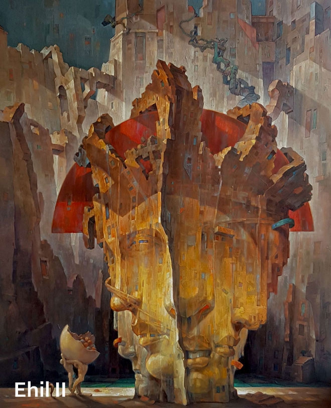 Bir kültürün ortak arzusundan geriye kalanlar, yaratılan ışık ve renk duyumları; bakanı hareketsiz bırakan bozulmuş, kübik figürlerin yarattığı tuhaf bir sessizliğin içinde, altüst edilen zaman ve durum algısıyla anıtlaştırılan insan ve hayvan bedenleri. Destansı değişimler, soyut alanlar, geometrik işaretler; fiziksel gerçekliğin tersyüz edildiği açık mekânlar.